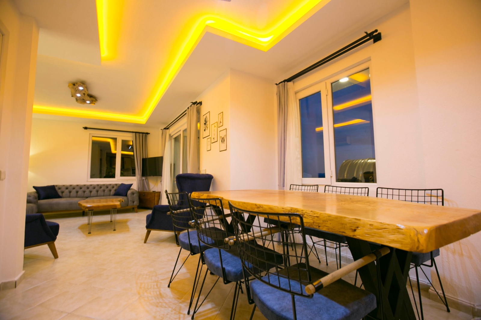 SALON: Masa ve sandalyeler, LCD TV., Oturma grubu, ütü ve ütü masası, lavabo, kablosuz modem, lavabo ve tuvalet bulunmaktadır. Salondan havuz kenarına çıkış vardır.