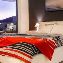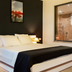 The master suite has a king-size bed, access to a balcony and a bathroom with shower.